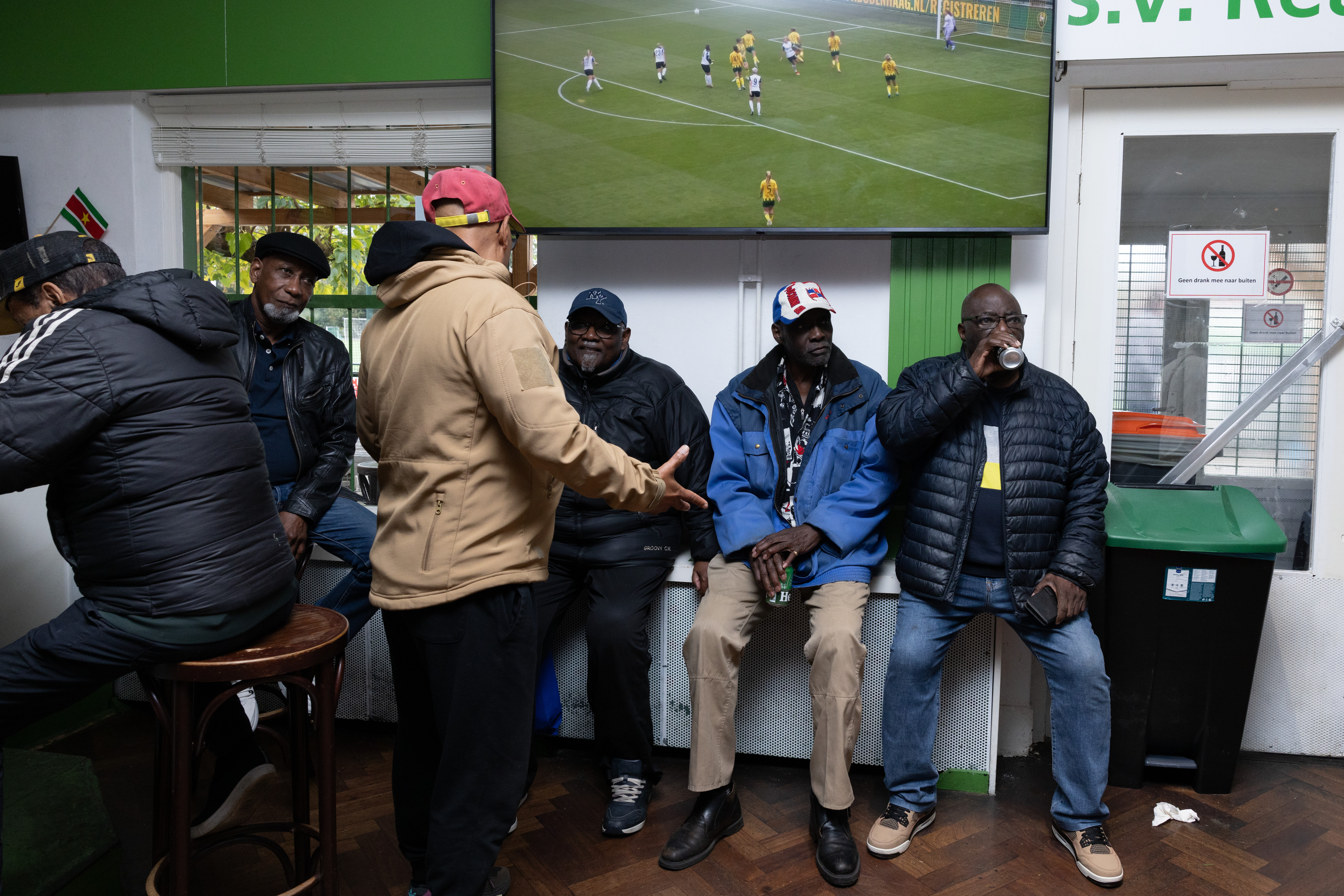 Voorzitter en oud-AZ-speler Jerrel Linger komt net aangewandeld. Hij speelt later op de dag met een veteranenteam. Hij vertelt dat Sranang de oudste Surinaamse club van Nederland is, opgericht in 1960 door een aantal Surinaamse voetbalvrienden die in het park voetbalden. ‘We hebben een mooie historie, de vaders van Rijkaard, Gullit, Vanenburg, Seedorf en Kluivert speelden al bij ons toen we nog in Amsterdam-Noord zaten. We hebben nog een keertje van Ajax gewonnen. De club zakte wat in, maar nu hebben we vierhonderd leden, een bloeiende jeugdacademie en nog steeds de Sranangse gezelligheid. Tegenstanders zijn altijd heel blij om hier te spelen, vooral om de keuken, het samenzijn, de lach.’