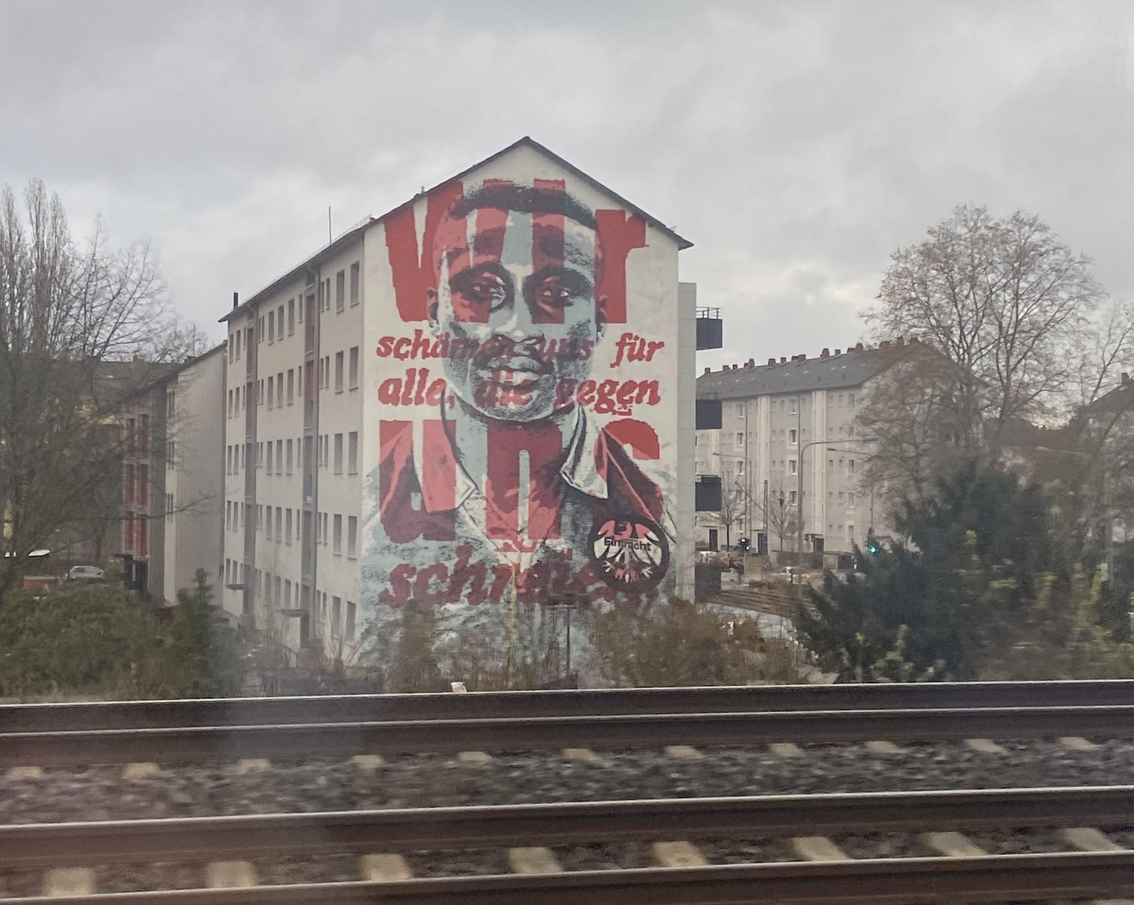 Verreweg ons favoriete kunstwerk hangt op Melibocusstraße 86, vlakbij het Deutsche Bank Park, en heeft een bijzonder verhaal. Begin jaren ’90 beleefde Eintracht hoogtijdagen en streed het mee om de bovenste plaatsen, met als blikvangers baltovenaar Jay-Jay Okocha en superspits Anthony Yeboah. Maar de Afrikanen kregen te maken met veel racisme vanaf de tribunes, van tegenstanders én van eigen fans. Om dit te memoreren is er een muurschildering van vijf etages hoog gemaakt, met een leus tegen racisme en een beeltenis van Yeboah, die je indringend aankijkt. Door de ligging tegenover station Frankfurt-Niederrad heb je vanaf het perron een geweldig uitzicht op het kunstwerk.