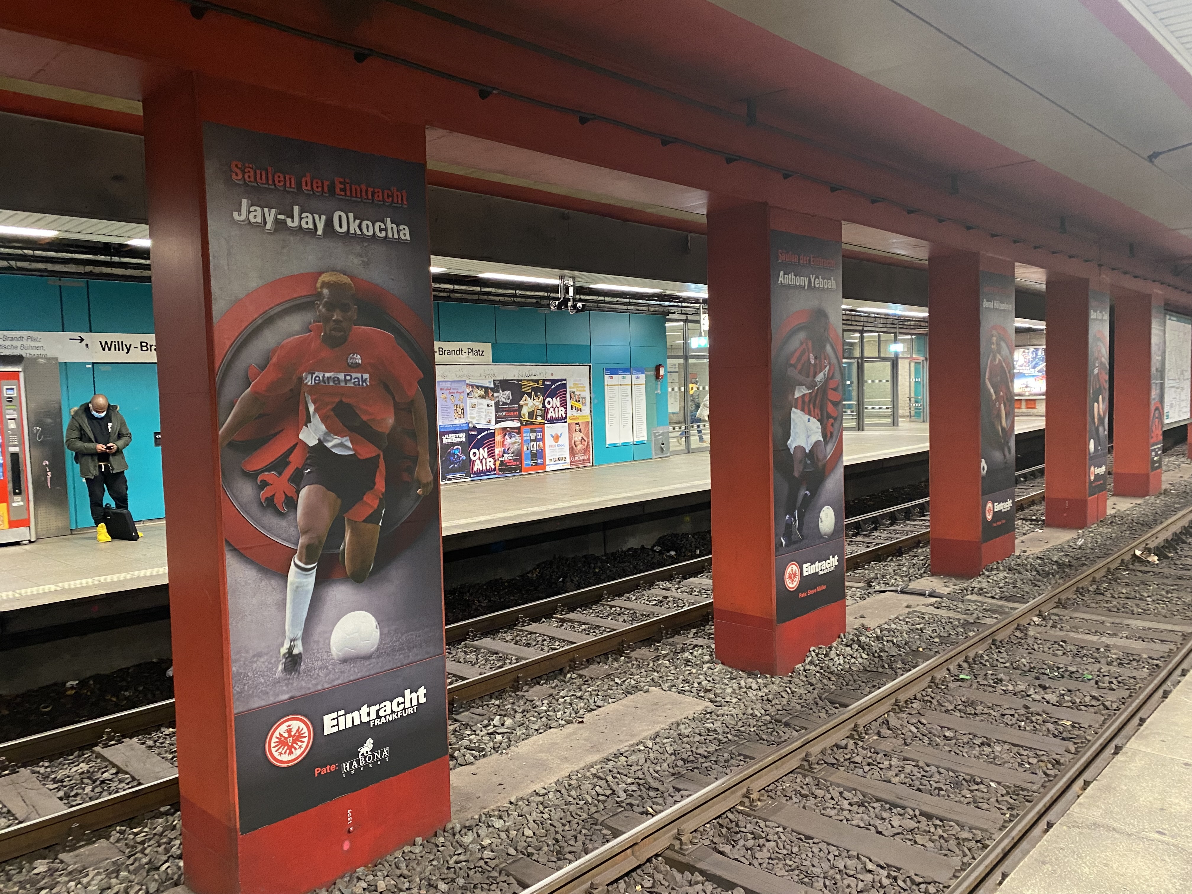 Midden in de bankenwijk van Frankfurt ligt de Willy-Brandt-Platz, met het grote kunstwerk van het Euroteken, beroemd in de financiële wereld. De voetballiefhebber komt ondergronds aan zijn trekken. In het metrostation zijn elf van de beste spelers uit de geschiedenis van Eintracht Frankfurt vereeuwigd op pilaren in de metrotunnel. Stuk voor stuk echte legendes van Eintracht, al begrijpen we het als je bij Hölzenbein en Grabowski snel doorloopt.