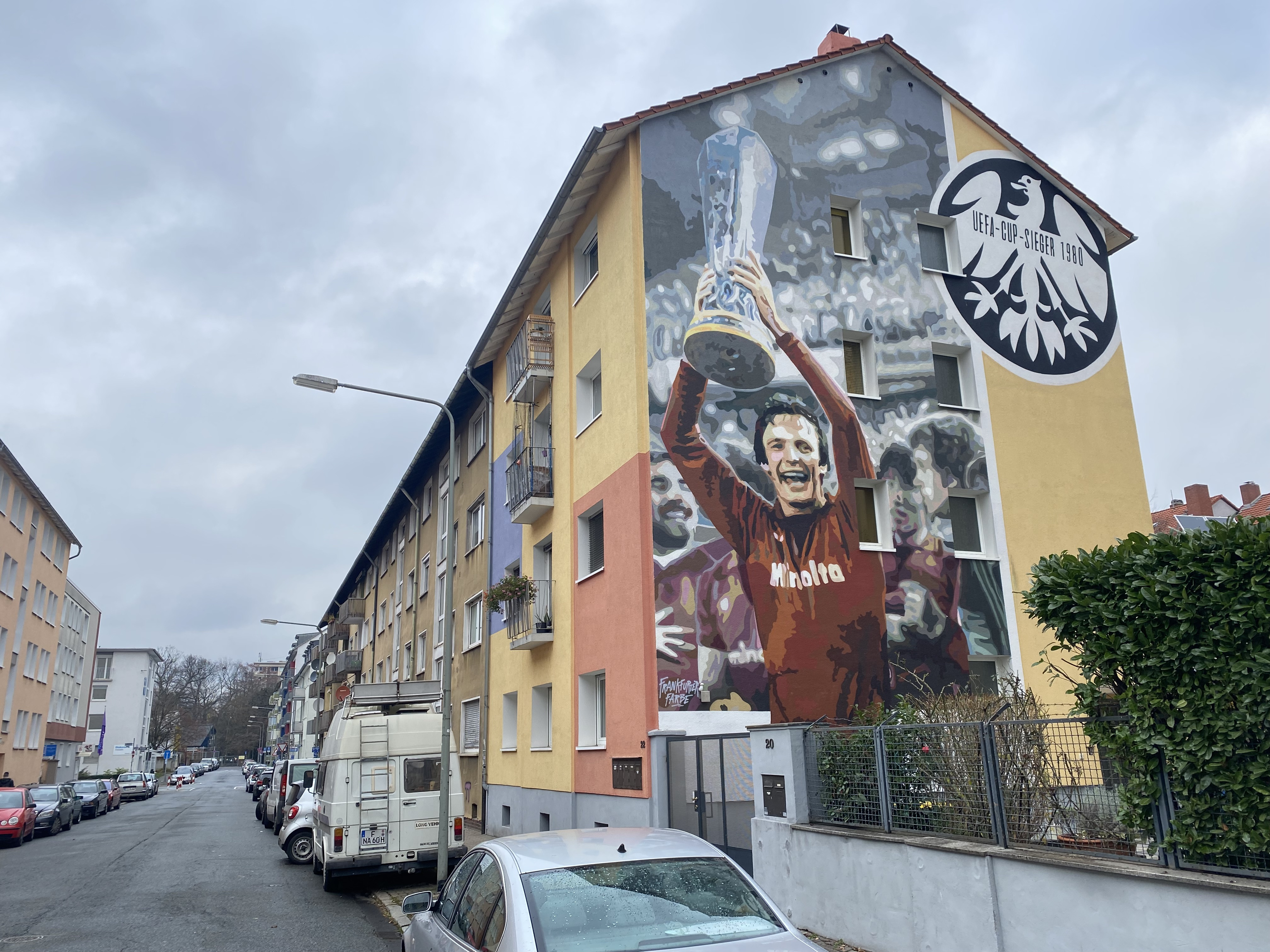 Op een zijmuur van het pand op de scherpe hoek Grüneburgweg/Unterlindau staat sinds een paar jaar een gigantische DFB-Pokal afgebeeld, een verwijzing naar de vijf bekerzeges van Eintracht Frankfurt, met de clubnaam en in plaats van het DFB-logo het logo van Eintracht.