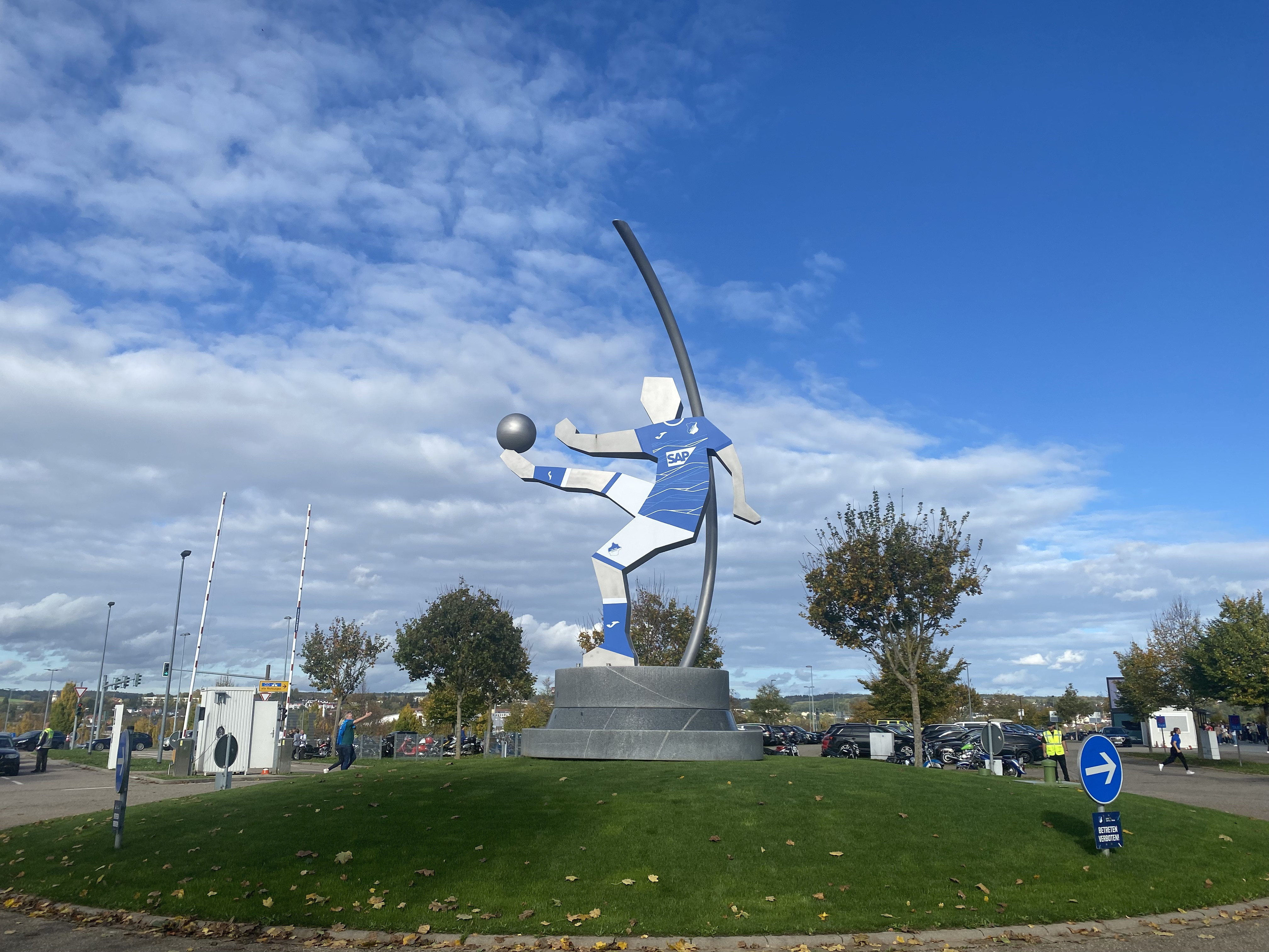 Pal voor de hoofdtribune van de PreZero Arena staat een vrij opvallend kunstwerk: een ronddraaiende, ijzeren sculptuur van een voetballer. Het vijf meter hoge werk is van lokale kunstenaar Wilhelm Schneider, een persoonlijke vriend van Dietmar Hopp.
