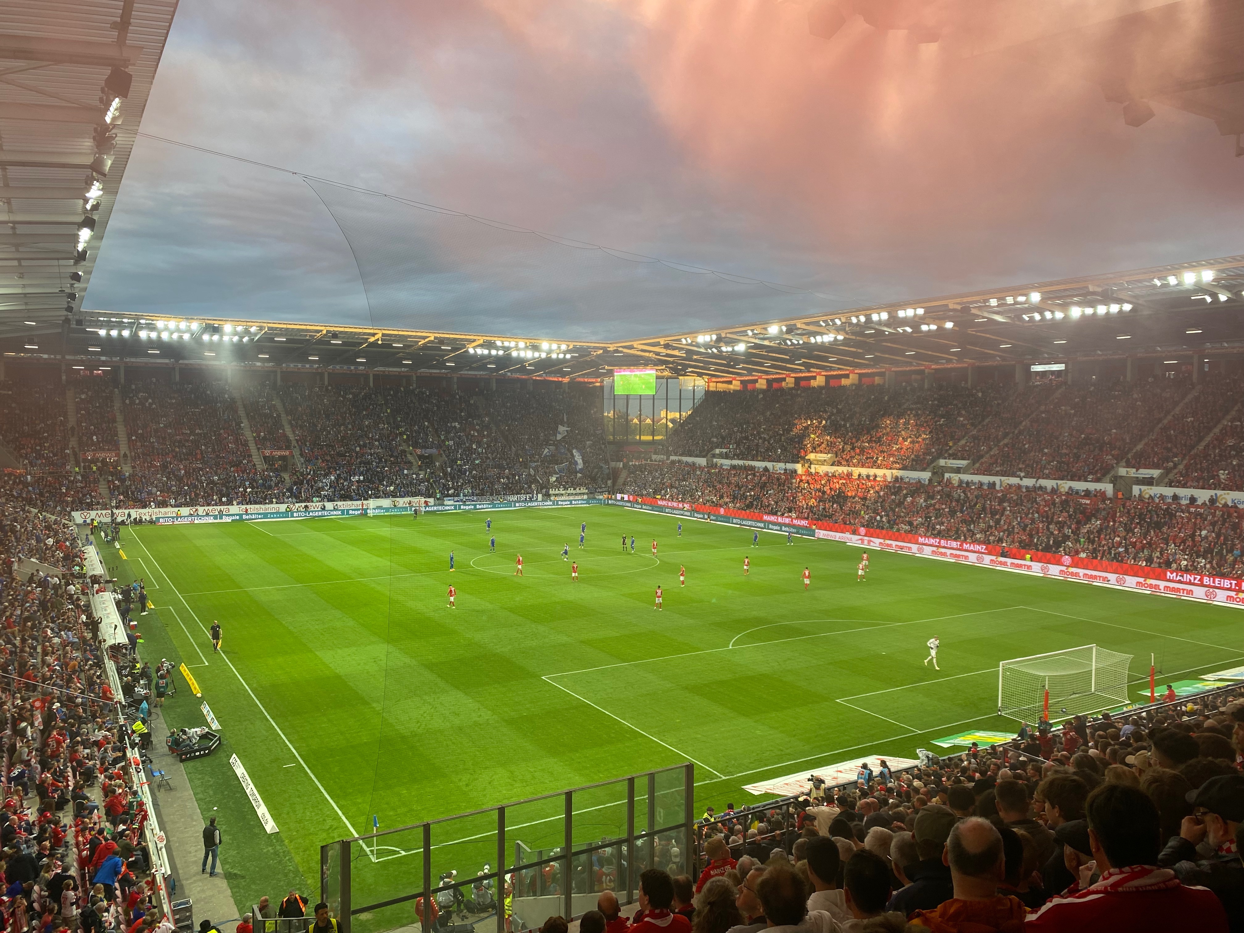 Om de groei van de club kracht bij te zetten werd in 2011 het nieuwe stadion van Mainz geopend. De locatie van deze grote, rode doos is op z’n minst opmerkelijk te noemen. Ten westen van Mainz, écht midden in het open veld. In een straal van enkele honderden meters rond het stadion is er geen gebouw te bekennen. Het maakt wel dat je de thuishaven van Mainz vanuit de verre omgeving al ziet liggen. Zeker ’s avonds, als het stadion verlicht is, is dat een prachtig gezicht. De binnenkant van de Mewa Arena is wat standaard, en doet kleiner aan dan het stadion werkelijk is. Er passen immers bijna net zoveel mensen in als in het Philips Stadion, zo’n 33.000 toeschouwers. Door de grote ramen in de hoeken van het stadion heb je een schitterend uitzicht op de landelijke omgeving.