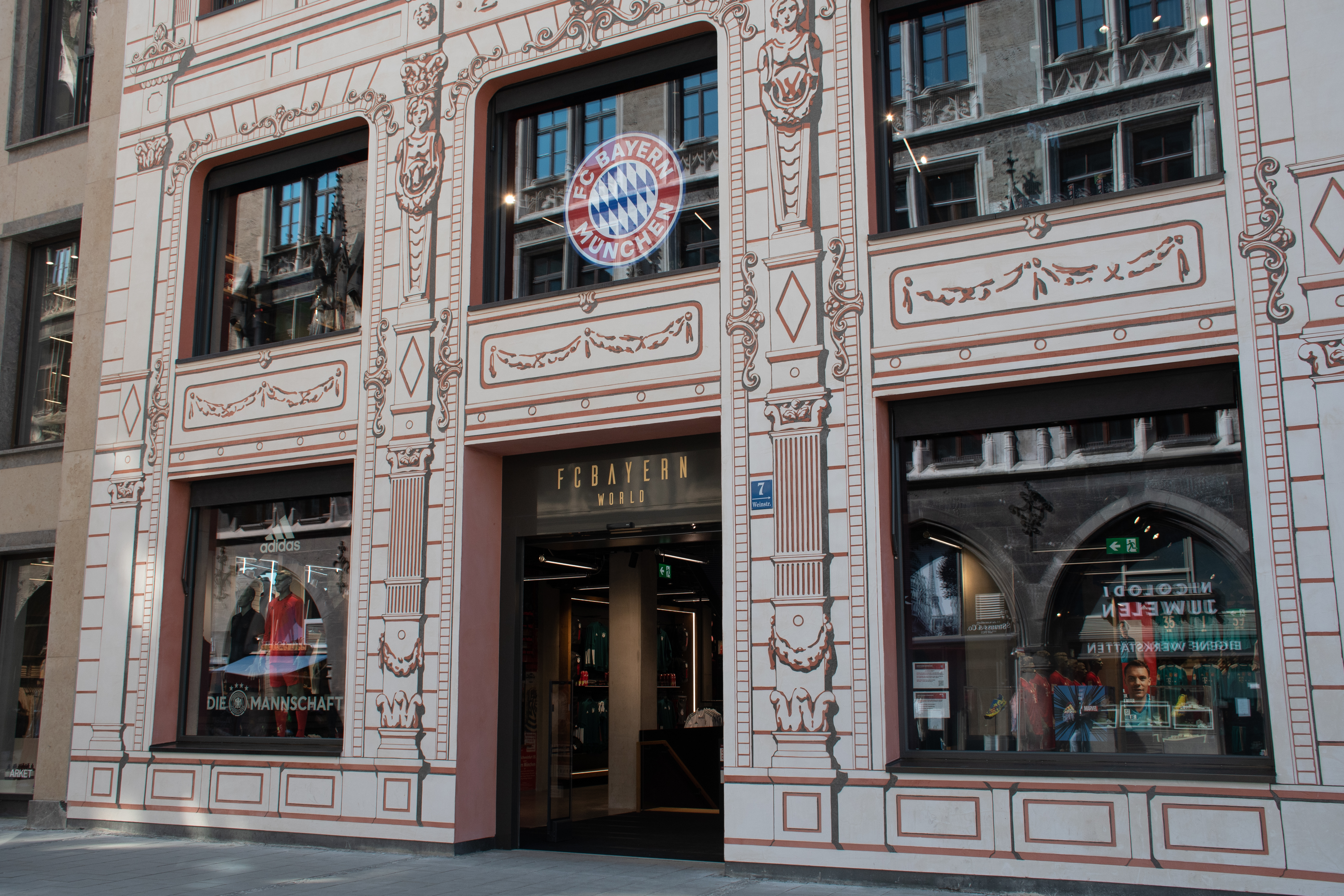 Als je op de Marienplatz de Weinstraße inslaat heb je na 80 meter aan je linkerhand het in 2020 geopende FC Bayern World; een zeven verdiepingen tellend pand met onder andere een prachtige fanshop, luxueuze hotelkamers en twee restaurants. Ook vind je er een aantal van de mooiste trofeeën die de club door de jaren heen gewonnen heeft.