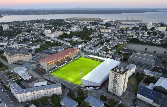 Lorient is een vrij overzichtelijk stadje waar niets ver weg is. Rij via de D465 Lorient binnen, volg de borden met ‘centre-ville’ en je komt vanzelf bij het stadion uit met het station ligt op nog geen tien minuten wandelen. Stade Yves Allainmat luidt de naam van het stadion officieel (naar een oud-burgemeester) maar in de volksmond spreekt iedereen van het Stade du Moustoir. Het biedt plaats aan amper 18.000 toeschouwers, en zit doorgaans zelden vol. Van buiten is het een beetje troosteloos, van binnen des te leuker dankzij het contrast tussen twee relatief nieuwe tribunes met twee ringen en twee oudere tribunes. De oranje clubkleuren die overal terugkomen geven het stadion iets heel eigens.