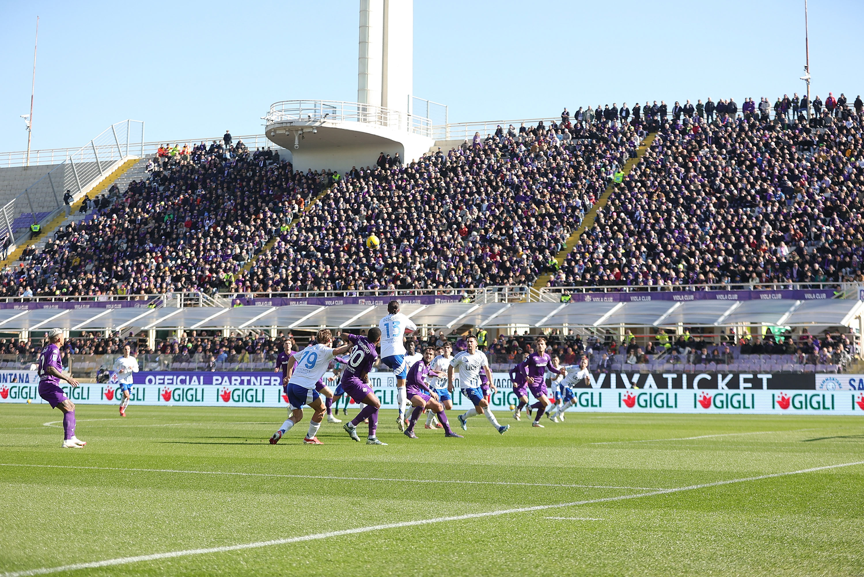 Het schitterende paars (‘La Viola’) van Fiorentina geeft dit stadion extra allure. De stoeltjes op de hoofdtribune zijn in de clubkleuren, aan de overkant vormen de paarse stoeltjes de clubnaam ‘ACF Fiorentina’. Ook mooi: de glooiende heuvels van Toscane zie je fraai liggen vanuit het stadion.